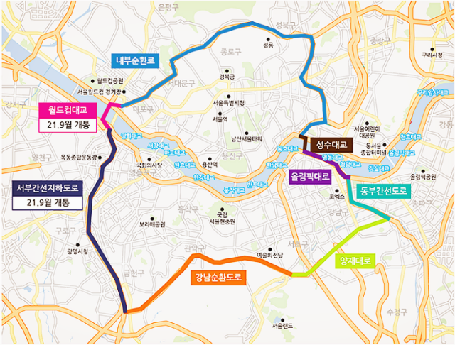 따라서 내부순환로 - 월드컵대교 - 서부간선지하도로 - 강남순환도로 - 양재대로 (무신호는 공사중) - 동부간선도로 - 강변북로 - 동부간선도로(내부순환로)의 연결로 서울순환형 간선도로망의 퍼즐이 완성되었습니다.