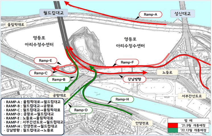 즉, 공항대로에서 월드컵대교, 안양천로에서 월드컵대교로 연결되는 램프는 이번 개통에서 빠진 부분입니다.