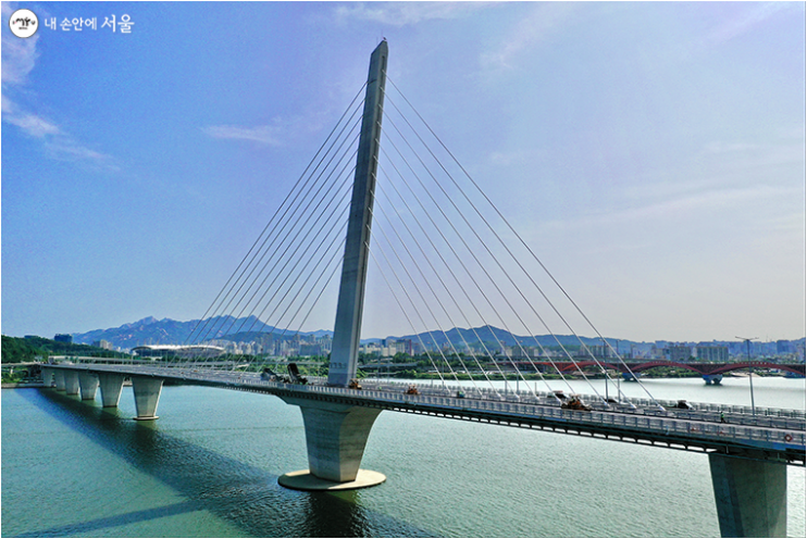 비대칭 사장교로 기존이 대칭 사장교인 올림픽대교, 행주대교와는 사뭇 다른 모습을 보여주고 있습니다. 경사각 78도로 설치된 주탑에서 뻗은 선들이 인상적입니다.