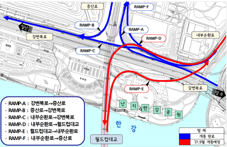 즉, 공항대로에서 월드컵대교, 안양천로에서 월드컵대교로 연결되는 램프는 이번 개통에서 빠진 부분입니다.