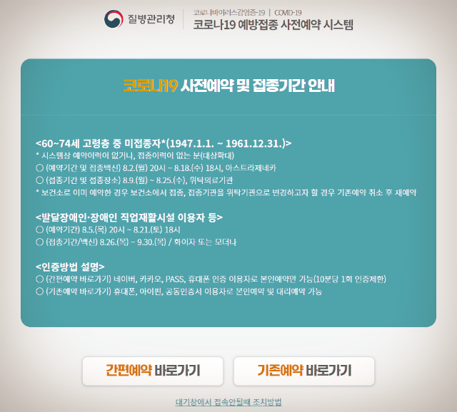글을 작성하는 시점에서는 60~74세 예약이 진행중이어서 위와 같이 보여지지만, 10부제를 하는 기간에는 화면이 각 날짜의 대상에 맞도록 변경이 됩니다.