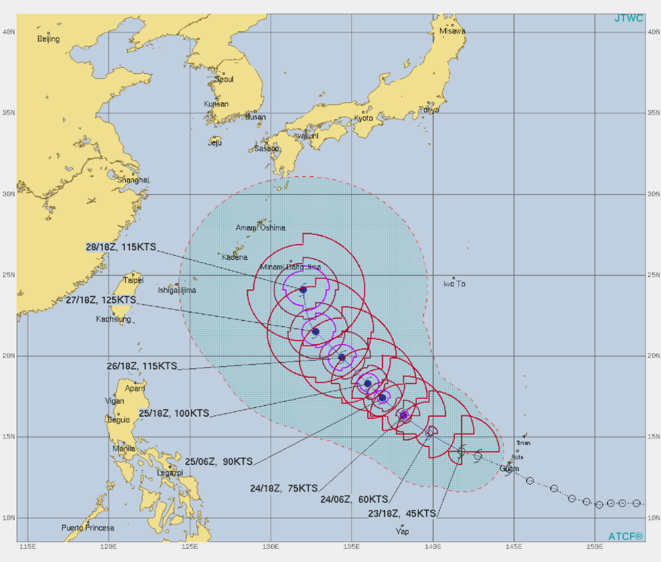 JTWC의 위성 영상을 보면 벌써 빠르게 태풍의 모습이 갖춰지고 있는 것을 볼 수 있네요. 앞으로 얼마나 강력하게 될지 잘 지켜봐야 할 것 같습니다.