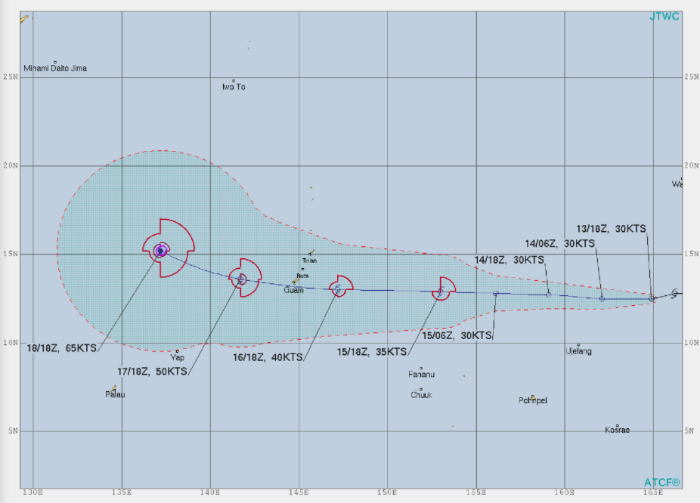 현재는 최대풍속이 30KTS 정도인 상태로 유지되고 있으나, 15일 저녁 6시 경 35KTS (18m/s), 16일에는 40KTS (20m/s)로 점차 강해지기 시작할 것으로 예상됩니다. 즉, 태풍으로 격상되어 본격적으로 예보가 될 것입니다. 아직까지는 공식적으로 태풍으로 분류되지는 않은 열대저압부 상태입니다.