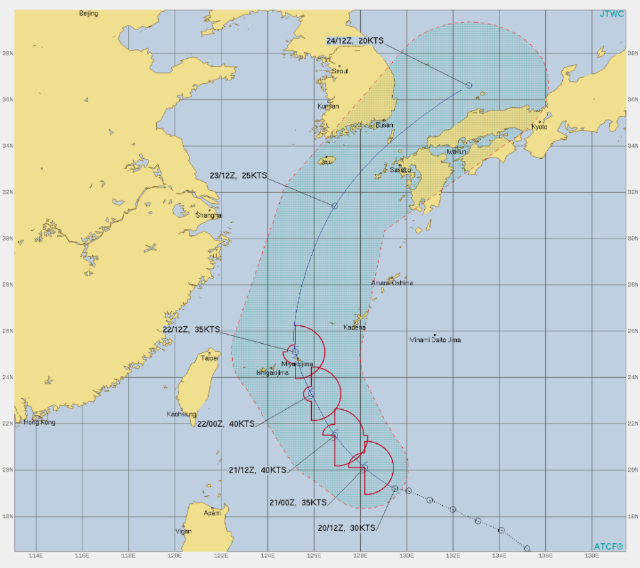 태풍이 될 것 같았던 열대저압부가 결국 태풍이 되기는 했습니다. 다행스럽게 이미 북상을 많이 한 상태에서 태풍이 되었을 뿐이고, 바다의 온도가 낮아지는 지역대로 바로 북상할 것이기 때문에 60시간 이내에 열대저압부로 다시 약해집니다.