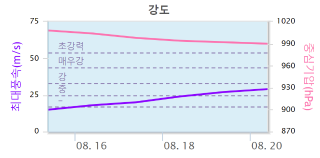 태풍의 강도는 점차 상승하여 (아래 그래프의 보라색 선이 최대 풍속의 증가입니다) 중형급 태풍으로 성장을 예상하고 있는데, 이후에도 점차 중심기압은 낮아지고 최대풍속은 높아질 것입니다. 현재까지 나온 예보 뒤의 그래프가 무시할 수 없는 상황인 것이죠.