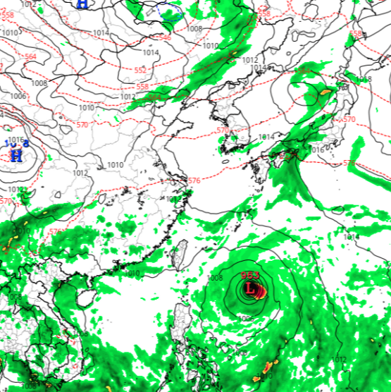 ▲ 120시간 후의 모습입니다. 중심기압이 953헥토파스칼까지 내려간 강력한 태풍의 모습을 보여주고 있네요. 역시 가을태풍의 위력이 느껴집니다. 큰 피해를 준 태풍들이 여름의 막바지, 가을의 초입에 많이 발생하고 있는 것이 이번에도 여지없이 나타날 것 같은 불안한 예보입니다.