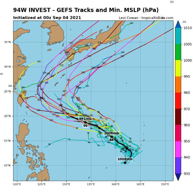 ▲ GEPS 모델은 훨씬 더 심각합니다. 이 모델로 예측을 한 것의 평균 값은 중심기압은 GEFS 모델보다는 낮지만, 예상 경로가 우리나라와 일본 사이의 대한해협을 정가운데로 통과하는 것이 평균값입니다. 이렇게 올라오게 된다면 제주도와 부산, 경남권에서는 태풍의 영향을 피할 길이 없어집니다.