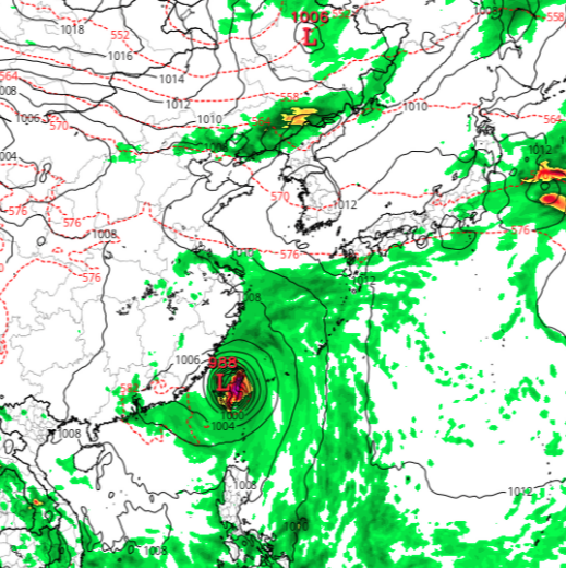 ▲ 168시간 후에는 대만에 상륙하여 지도상에서 대만이 아예 보이지 않는 상황을 보여주고 있습니다. 대만에 상륙후 중북 남동부 내륙에 살짝 상륙한 이후 빠르게 북동진하면서 잔재 세력이 일본을 관통하며 지나갈 것을 예상하는 하나의 예상 경로도 있습니다.