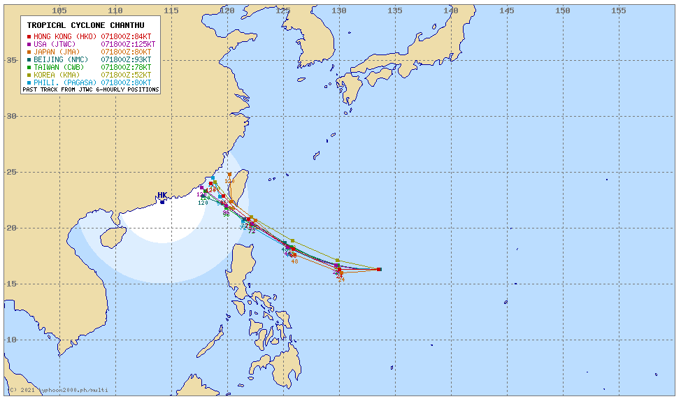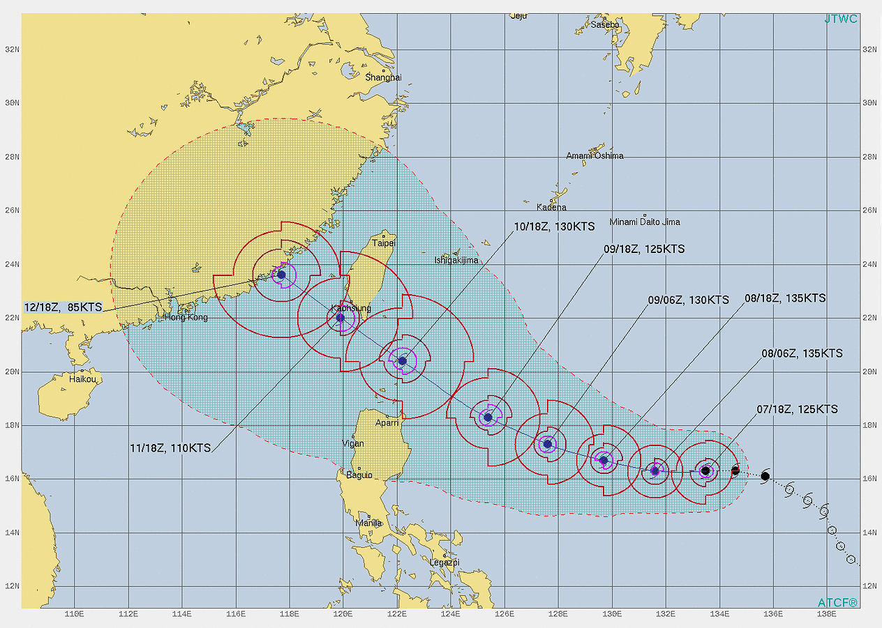 홍콩기상청, 미국기상청, 일본기상청 중국기상청, 대만기상청의 예측 경로를 모은 데이터입니다. 일본기상청을 제외하고 모두 비슷한 경로를 예측하고 있습니다. 일본 경로는 저기서 방향을 바꿔서 자국으로 가는 경로를 보고 있는 것입니다.