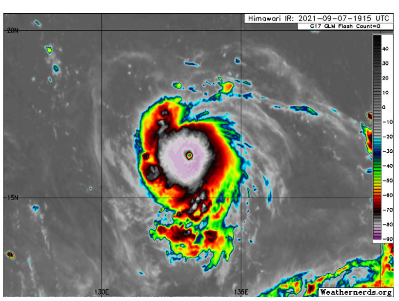 IR이미지로 살펴본 태풍 14호 찬투의 모습입니다. 위성사진과 온도를 함께 보는 것인데요, 중심부에 태풍의 눈이 형성되고 있는 것이 보여집니다. 중심기압 985에 눈이 형성될 정도로 빠른 속도로 발달하고 있습니다.