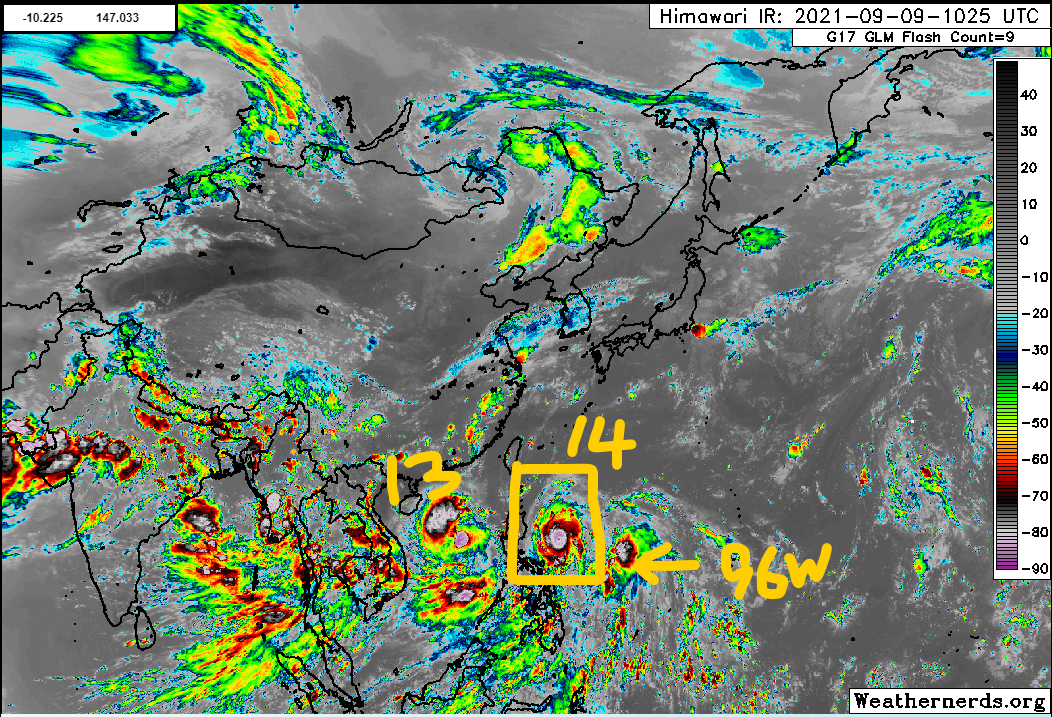 현대 3개의 열대저기압이 활동을 하고 있는데, 13호는 필리핀을 지나가서 남중국해에서 서쪽을 향하고 있고, 14호 태풍 찬투는 대만을 향해 이동하고 있으며, 그 뒤를 따라 새로운 열대요란 96W가 뒤따르고 있습니다. 찬투의 뒤를 따라 계속 쫓아온다고 예상을 하고 있네요