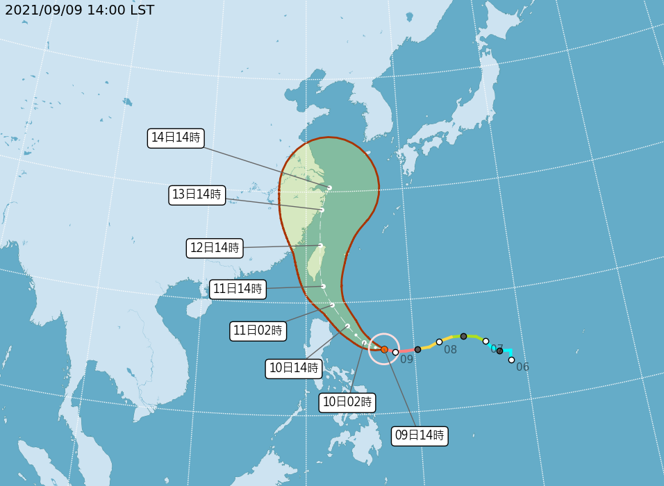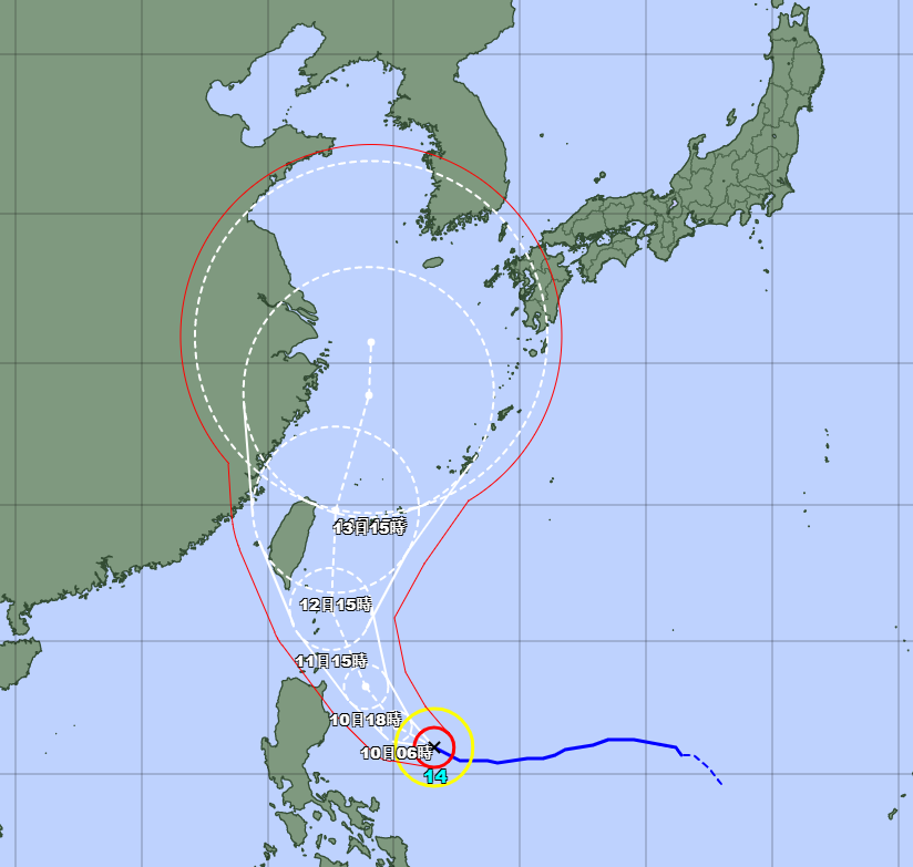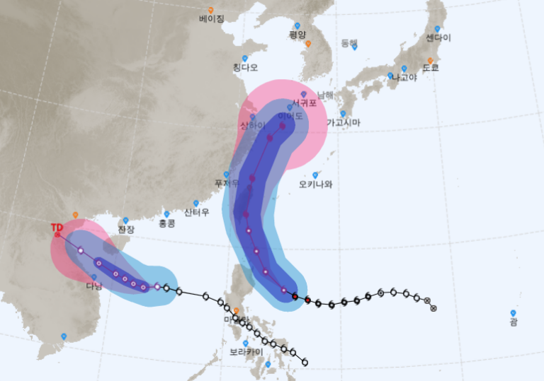 한국 기상청에서의 경로가 오전 발표보다 약간 동편화 되었습니다. 대만을 스쳐 지나가는 경로에서 조금 오른쪽으로 이동해서 대만 남부를 스쳐 지나간 후 중국 남동부 해상동 스쳐 지나가면서 서해상으로 빠져나가는 경로로 바뀐 것입니다.