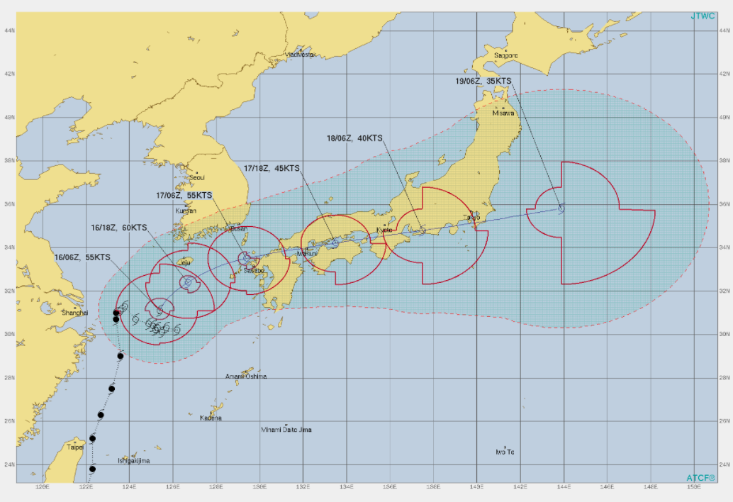 위도 30도 이상으로 올라와서 이런 움직임을 보이는 태풍은 흔하지 않습니다. 매우 오랜동안 중국, 일본, 한국(제주)에서 가장 피해가 안 가는 곳에서만 맴돌았습니다. 이제 그만 맴돌고 움직이는 형국입니다.