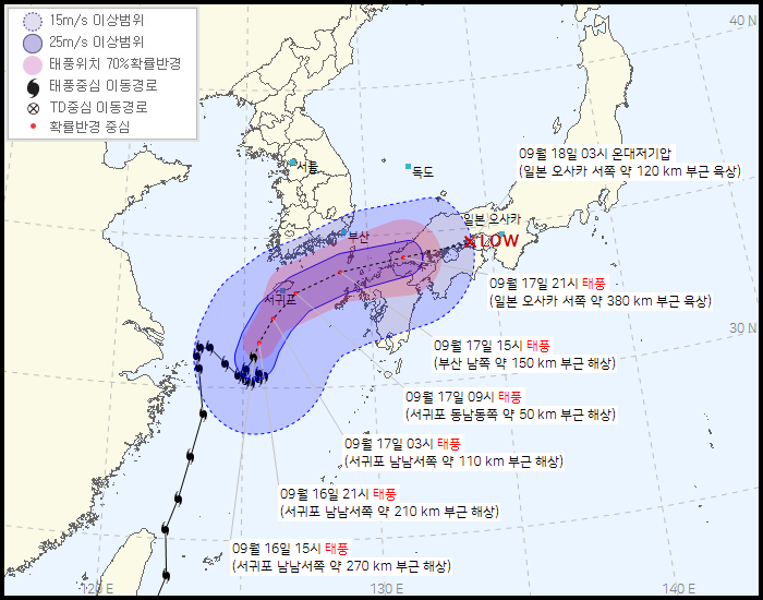 기상청의 예보입니다. 오전에 발표한 것과 크게 다르지 않습니다. 다른 나라보다 유독 제주에 가깝게 표시를 하는 점이 아쉬운 것 같습니다. 내일 9시 정도 제주에 최근접하고, 생각보다 빠르지 않은 속도로 천천히 이동해서 17일 밤이 되면 우리나라의 영향은 거의 끝날 것으로 예상됩니다.
