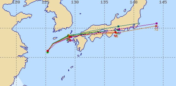 각 국가별 예상하는 경로가 조금 더 남하했습니다. 남부지방의 피해도 거의 없을 정도로 좀 떨어져서 가게 되었습니다. 일본기상청, 대만기상청, 중국기상청 모두 비슷하게 일본을 관통하는 것으로 보고 있습니다. 우리나라 기상청이 가장 북쪽을 예상하고 있네요