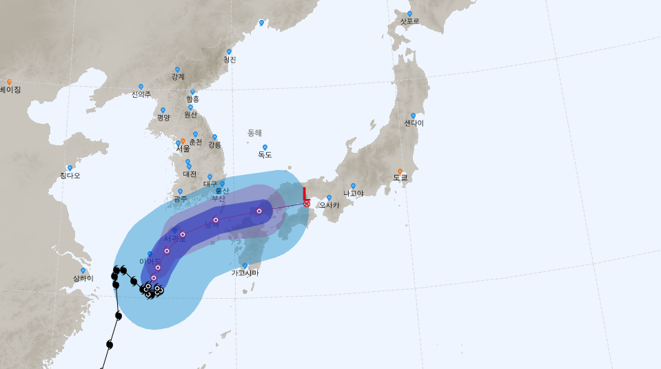 위 경로대로 오면 제주에 매우 가깝게 스쳐지나가는 경로입니다. 그래도 우리나라 남부로 오느냐 마느냐, 제주와 남부 해상 사이로 가느냐 마느냐 갈팡질팡이었는데, 우리나라 근처까지 온것에 비하면 매우 준수하게 통과합니다.