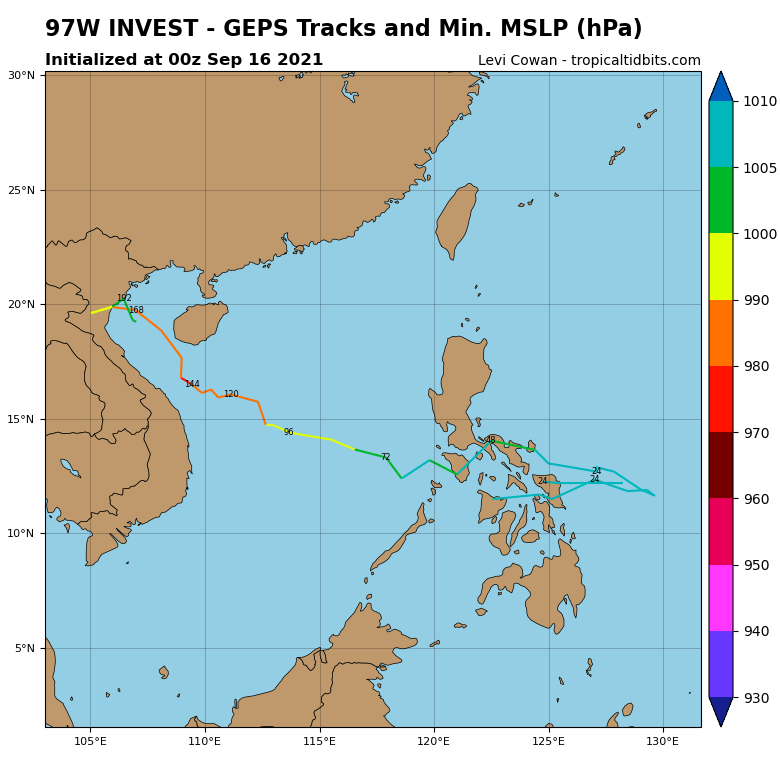 Tropicaltidbits에 올라온 GEPS 예측 모델에서는 열대요란 상태로 필리핀을 통과한 후 남중국해에서 태풍이 되었다가 13호 태풍 꼰선과 같은 경로로 베트남 북부로 가는 것을 예상했네요. 하지만 완전 극초반이라는 것.