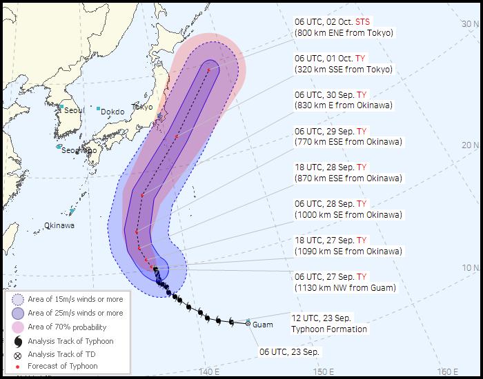 예보가 업데이트 될때마다 도쿄에서 멀어지고 있으므로 슈퍼태풍이 되는 16호 태풍 민들레이지만, 피해를 당할 수 있는 지역은 점점 줄어들고 있다는 뜻이 됩니다.