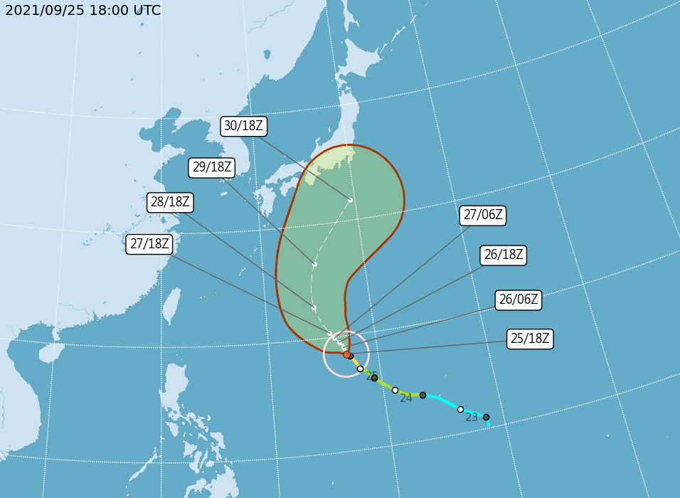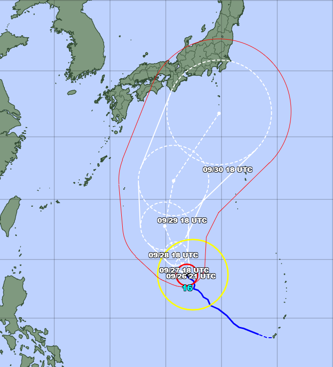 우리나라 기상청의 자료를 보면 9월 26일 현재 위치에서 북서쪽으로 더 움직인 이후 태풍은 서쪽으로의 이동은 멈추고 북으로 향하게 됩니다. 이후 조금 더 올라온 후 일본 도쿄를 향해 약간 동쪽으로 꺽어지는 모습이 보여집니다.