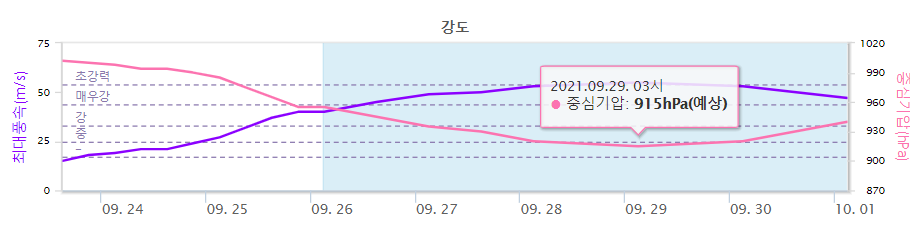 태풍의 강도는 현재 지속적으로 발달하는 과정에 있습니다. 최대풍속이 50m/s를 지나 초강력 태풍의 기준까지 오를 수도 있습니다. 최저 중심기압은 915헥토파스칼로 3일 이내에 도달할 것으로 보여집니다.