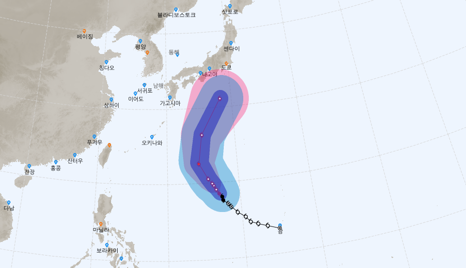 일본 기상청에서도 마지막 날짜의 예포를 보면 도쿄에 상륙할 가능성이 낮은 경로를 보여주고 있죠. 이런 예상경로라면 일본에 상륙하지는 않을 것 같네요.