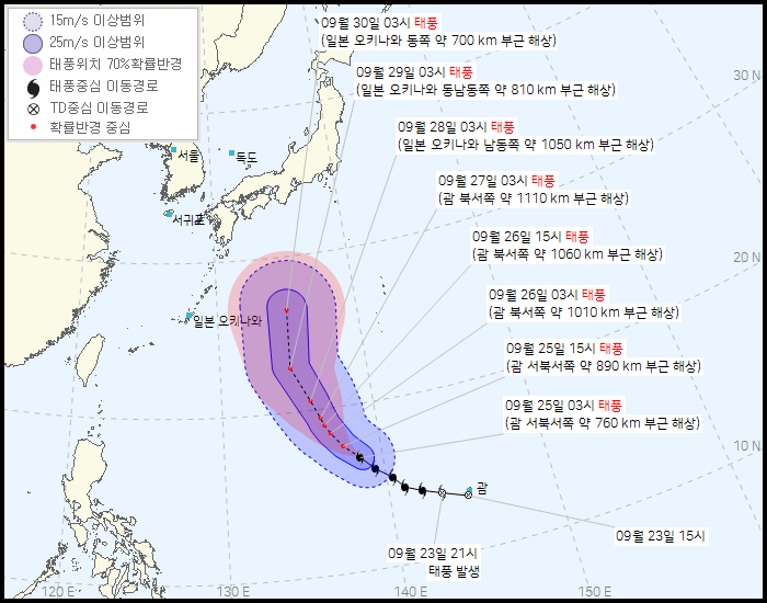 일본기상청에서의 태풍 경로 예상입니다. 9월 29일이 지나면서 동쪽으로 살짝 꺽는 모습을 이미 예상하고 있네요. 하지만 아직 확률 반경은 매우 크기 때문에 어느 쪽으로 갈지는 지켜봐야 합니다.