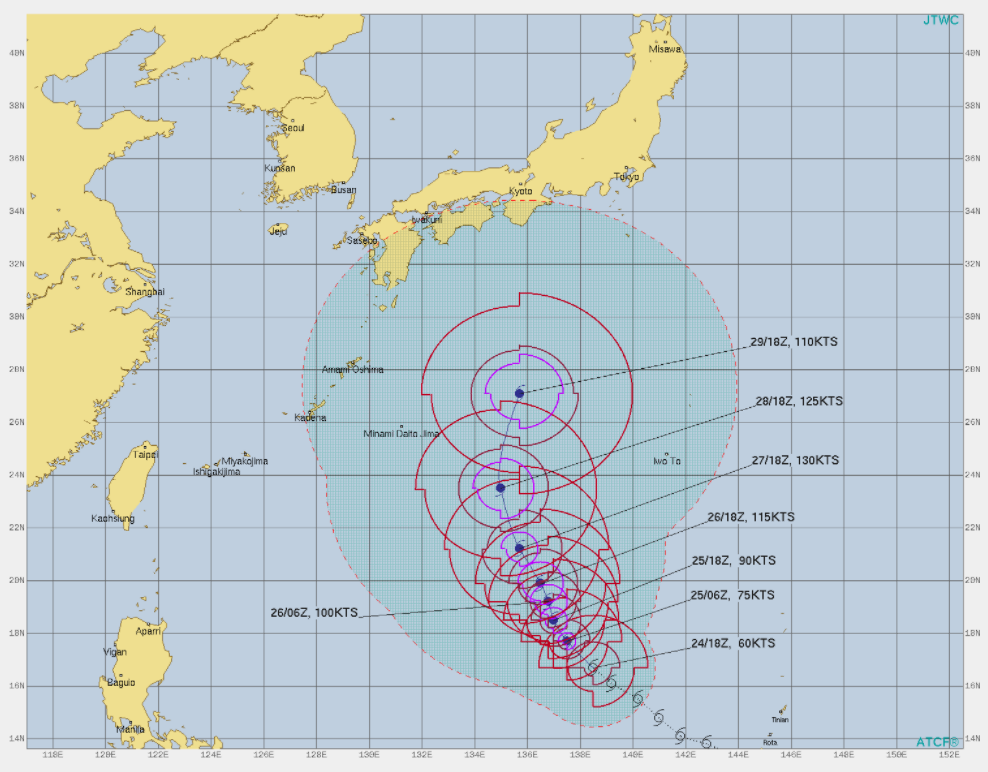 JTWC의 예상경로도 역시 일본 아래에서 북동 방향으로 자리를 잡는 것으로 예상하고 있습니다. 태풍의 세력은 3일 이내 최대 강도를 찍을 것으로 예상하고 이때 강도는 130노트로 슈퍼태풍이 되는 것으로 보고 있습니다. 무시무시한 태풍이 되는 것이죠.